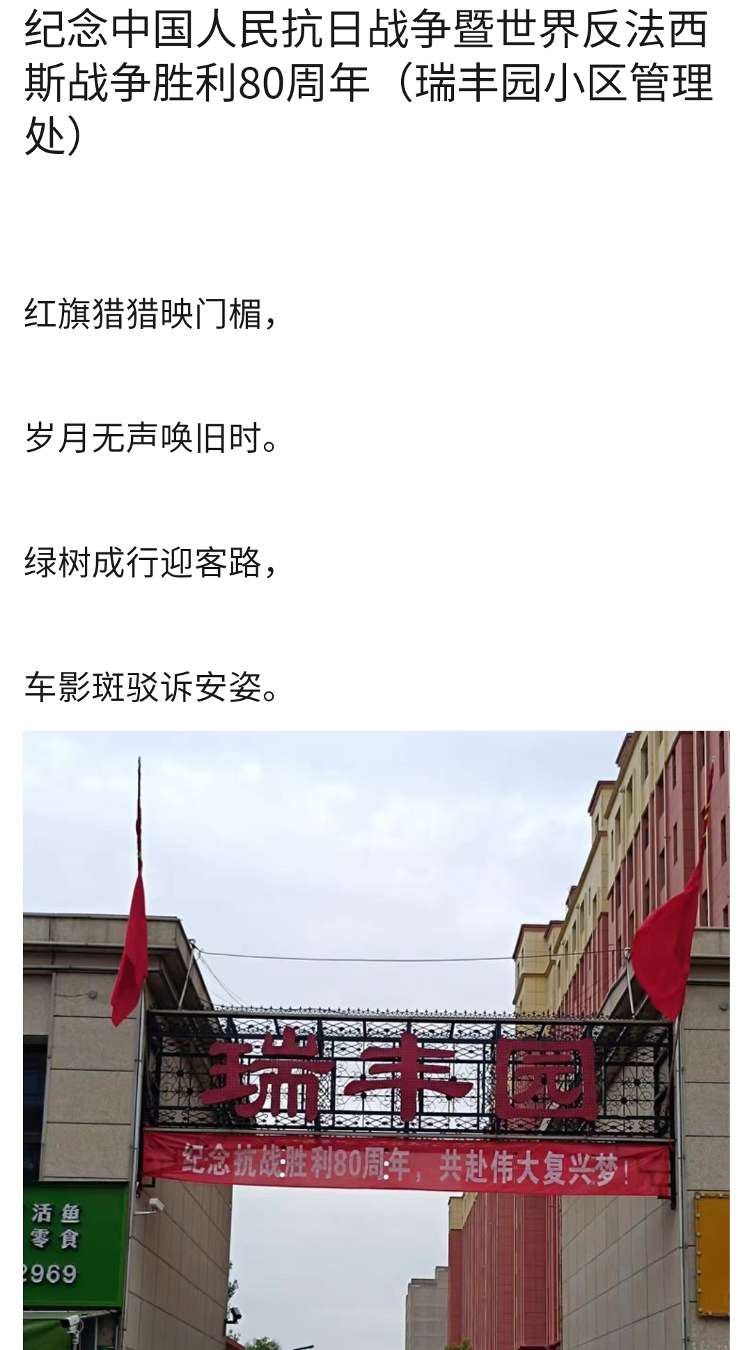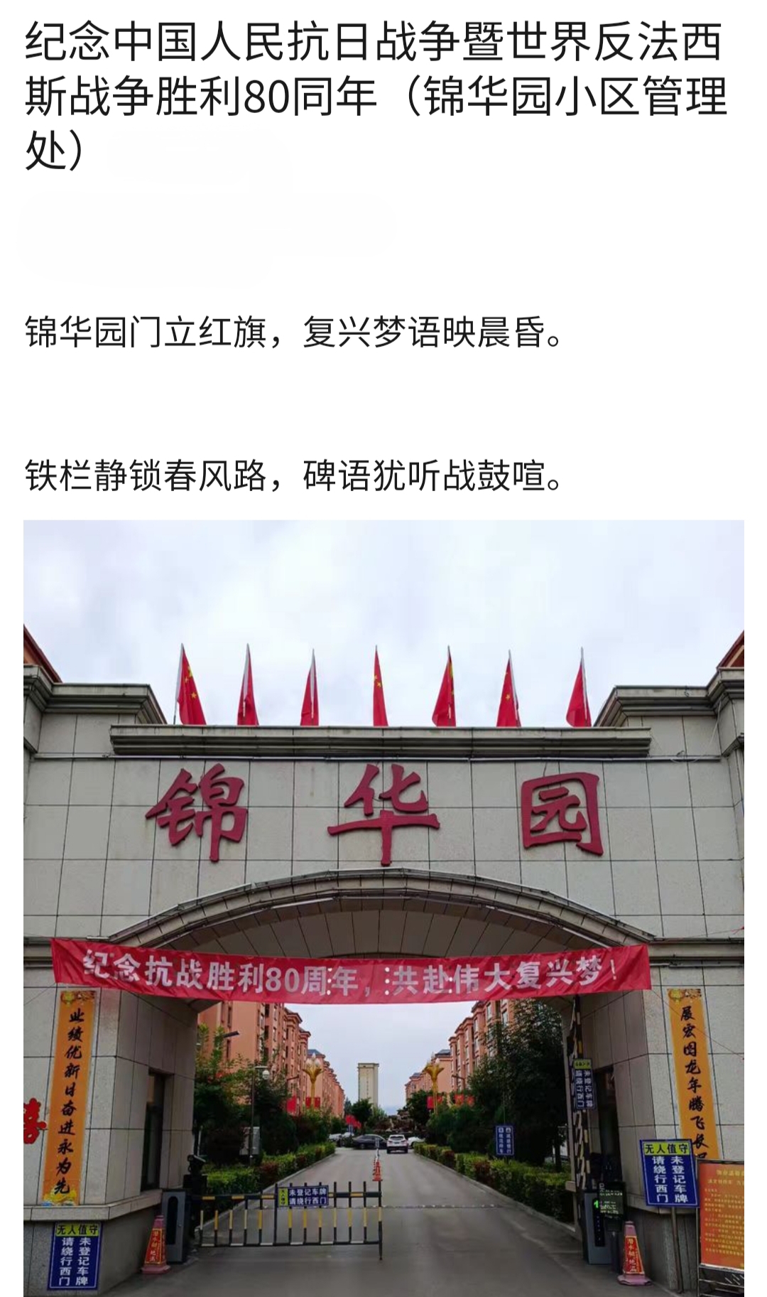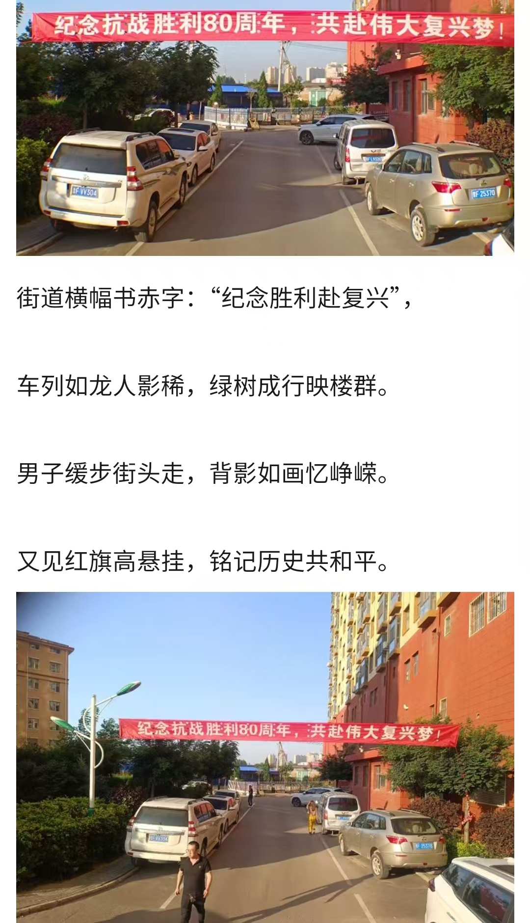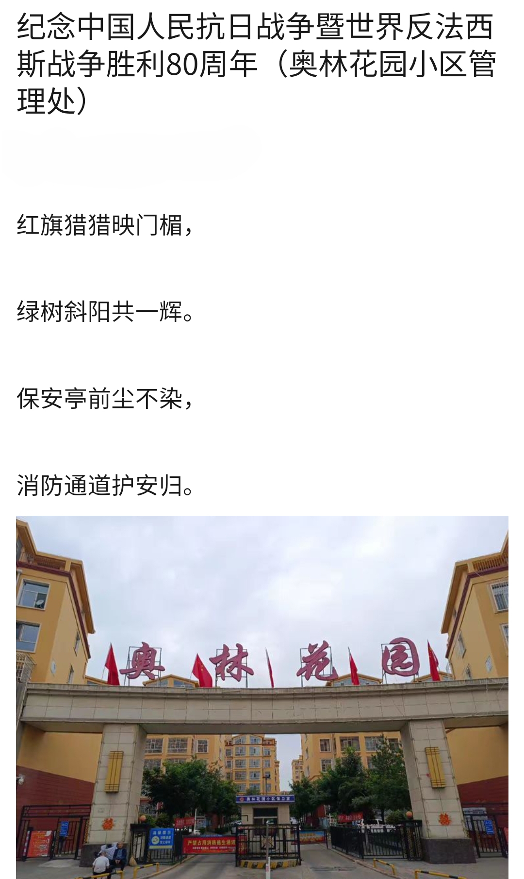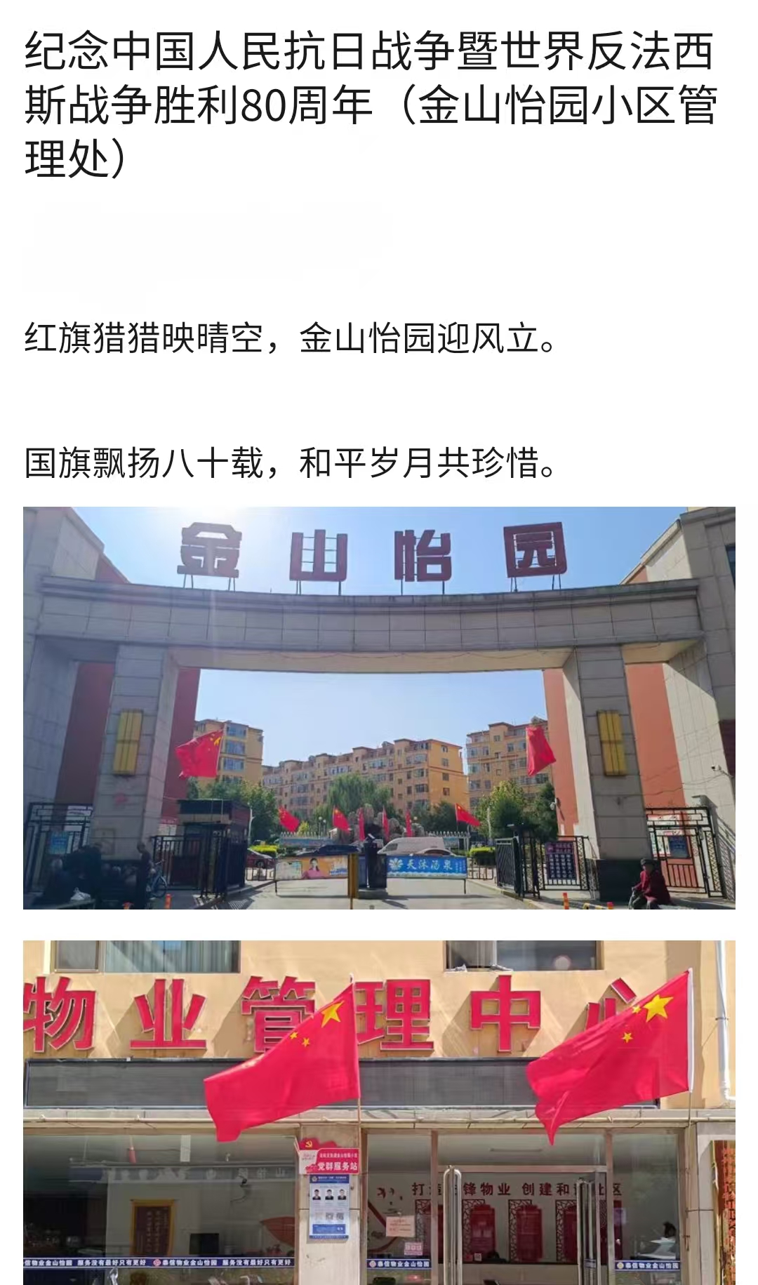 9月2日,泰信物業(yè)各管理處員工把一幅幅紀(jì)念抗戰(zhàn)勝利80周年的條幅懸掛在小區(qū),讓大家更好地銘記歷史,珍惜當(dāng)下的和平歲月。